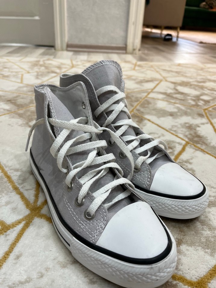 Gri renkte, bağcıklı ve düz tabanlı Converse ayakkabı çok rahat ayakta çok şık duruyor neredeyse her kombinin altına çok rahat gidebilecek bir tarz