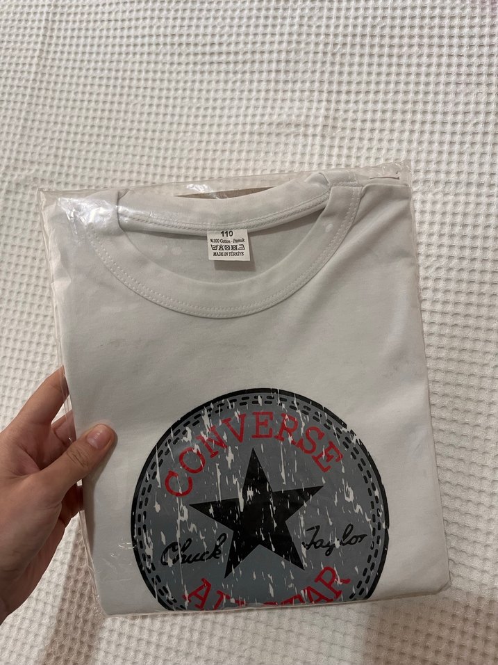 Beyaz renkli Converse baskılı erkek tişörtü, kısa kollu ve yuvarlak yaka. Pamuklu kumaştan, rahat ve bol kesimlidir, günlük kullanıma uygundur.