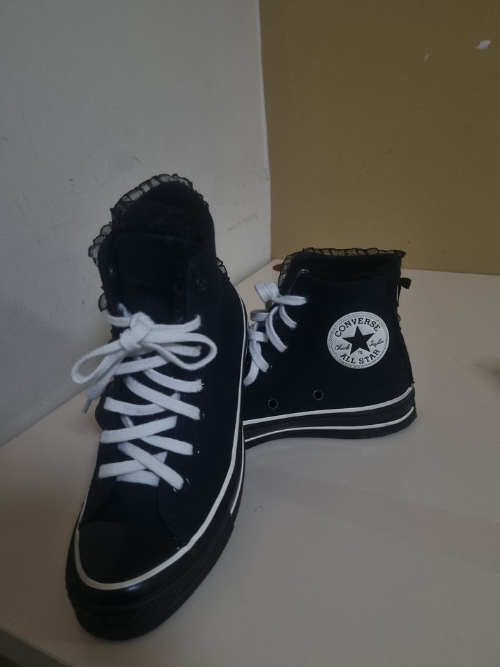 Siyah renkte, fırfır detaylı kadın sneakers. Goth ve grunge punk tarzlarını yansıtan şık bir model. Çok az kullanıldı ağustos 2025 de aldım. Topuğu yüksek geldiği için satıyorum. En son fotoğrafa aldığım fiyatı ekledim 2800 civarı bir fiyata almıştım.♡♡ Göğüs80cm Bel60cm Kalça88cm Boy173cm Kilo55kg