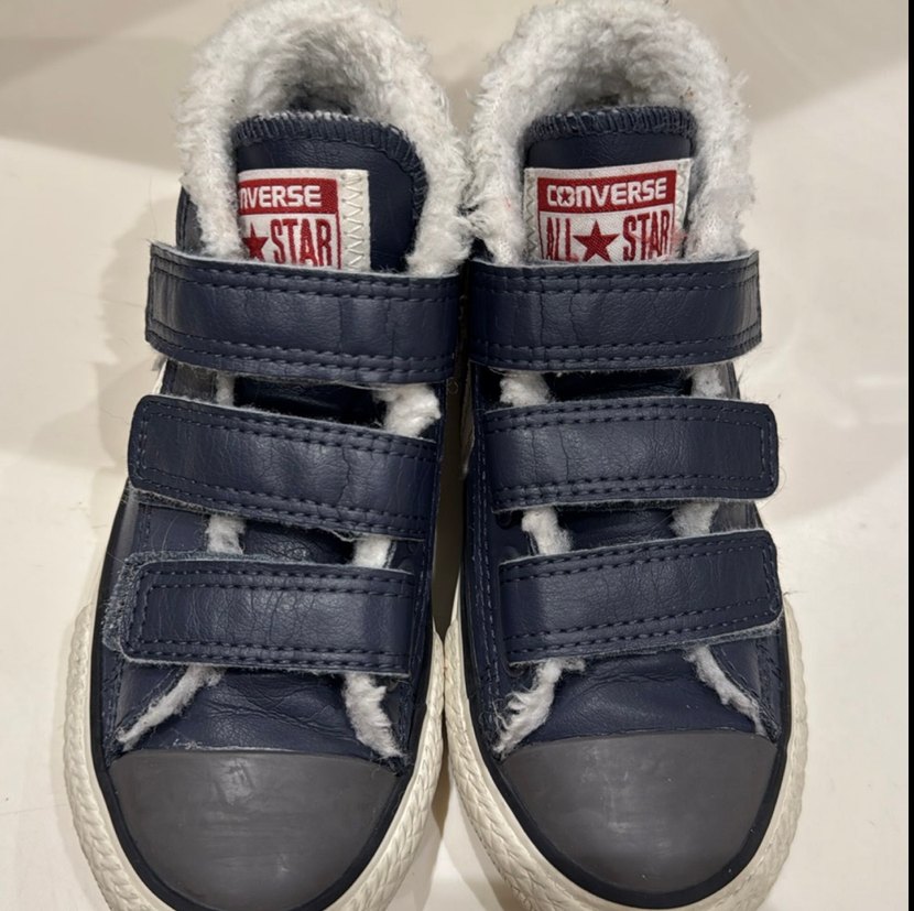 Converse erkek çocuk mavi sneaker, gri baskılı detaylar, cırt cırtlı ve kauçuk tabanlı. Yumuşak, sıcak astar içerir.