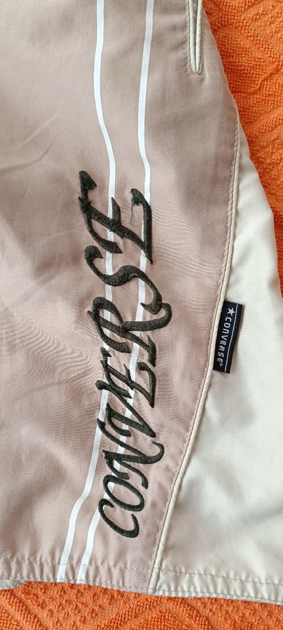 Bej ve gri kumaş üzerine Converse markasının şık yazı stiliyle erkekler için tasarlanmış rozeti.