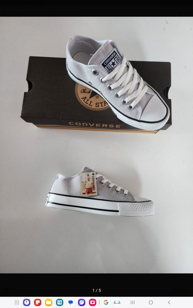 Converse sneakers, gri ve beyaz renklerde, düz kauçuk tabanlı ve baskılı desene sahip, günlük kullanım için rahat ve şık bir sokak stili ayakkabısıdır.