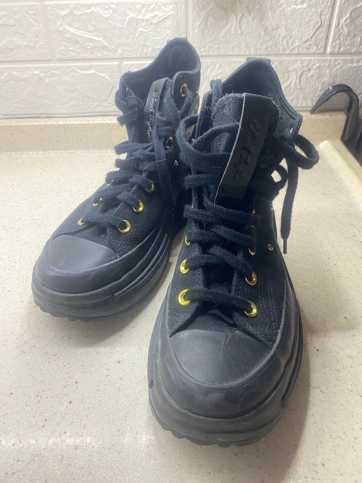 Kadınlar için siyah zımbalı sneaker, düz kauçuk yüksek tabanlı ve bağcıklı tasarıma sahip. Günlük kullanım için rahat ve dayanıklı. Hediye geldi, hiç giyilmedi. Converse.