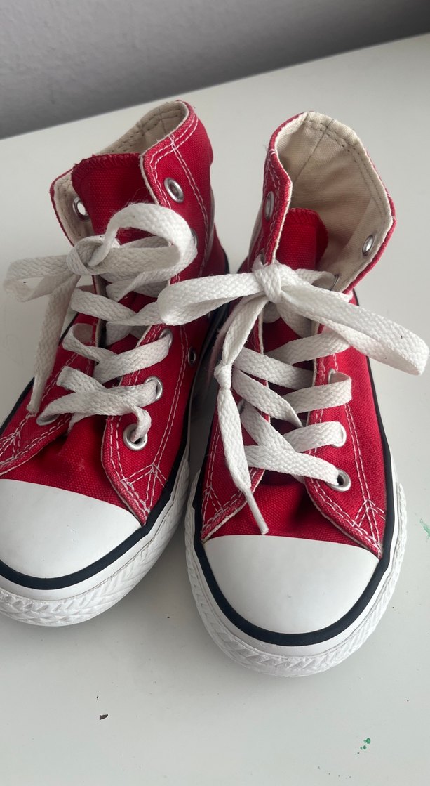 Kız çocukları için kırmızı elastik özellikli, beyaz bağcıklı, kauçuk tabanlı spor ayakkabı. Düz ve desen içermeyen, karşı kültür tarzında.