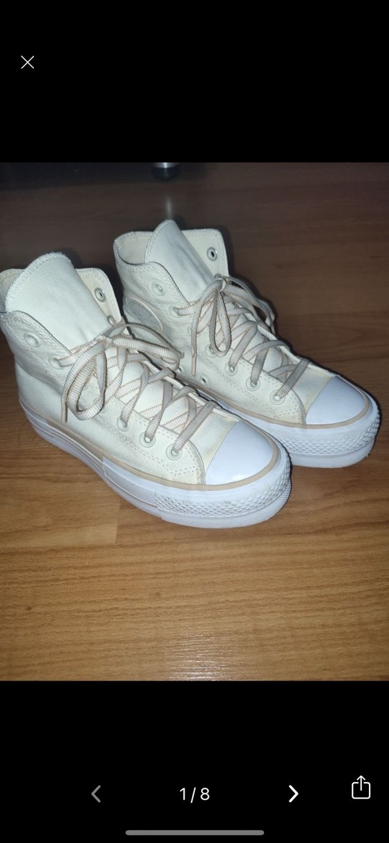 Çok az kullanıldı, krem rengi rengi platform topuklu, bağcıklı kadın spor ayakkabısı. Kauçuk malzemeden, günlük sokak stili için uygun. Pastel tonları trend görünümü destekler.