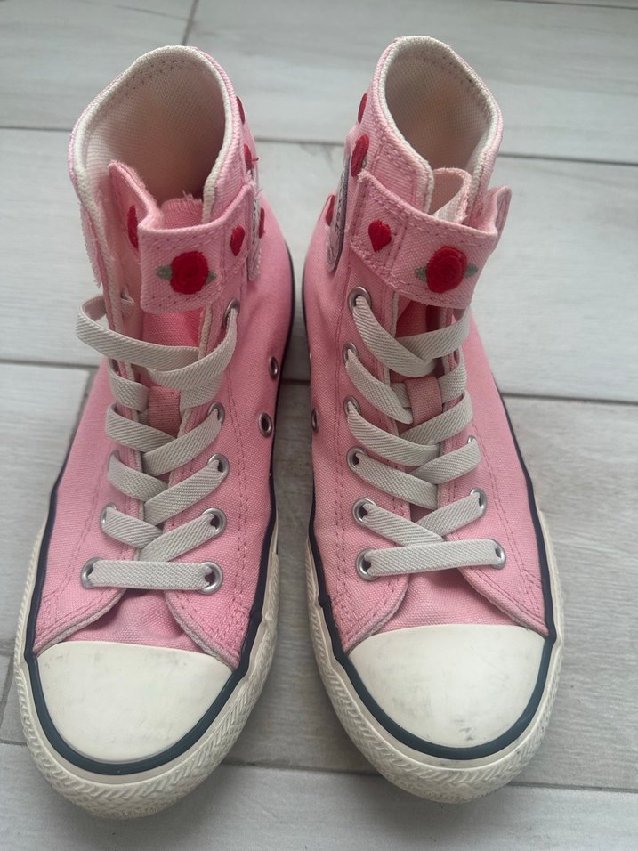 Pembe pastel renkte, bağcıklı ve düğmeli yüksek top kadın spor ayakkabısı, rahat ve şık bir görünüm sunar. 33,5 numaradır. Dikkat