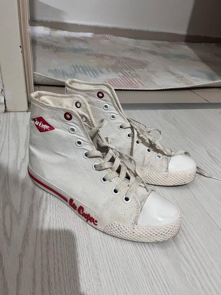 Beyaz, düz tabanlı, bağcıklı kadın spor ayakkabısı. Kauçuk tabanlı 1 kere kullanıldı makinede düşük ayarda yıkanırsa kirleri çıkar :)