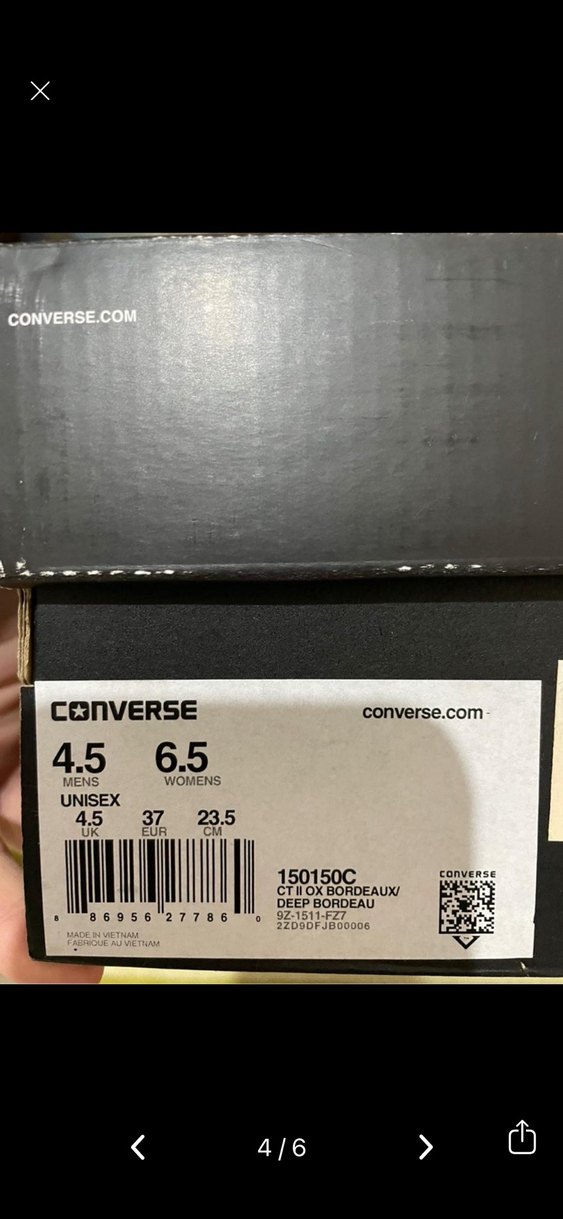 Unisex, erkek ve kadın ayakkabı numaraları içeren siyah Converse ayakkabı kutusu. Ürün bilgileri ve kare kod bulunur.