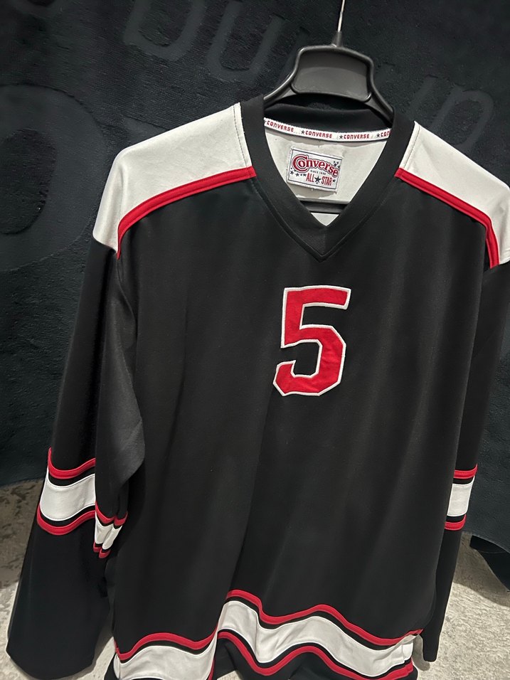 Converse marka, siyah renkli, yumuşak kumaştan, V yaka ve uzun kollu, bol kesim spor tişört. Önünde '5' baskısı ve cırt cırt detayları bulunur.