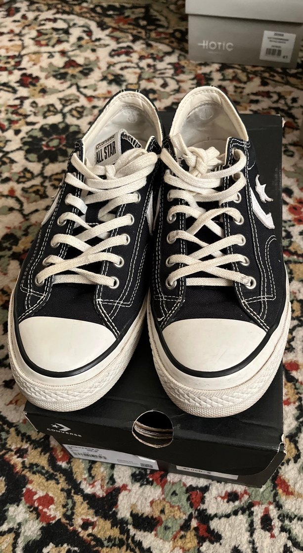 Unisex Converse Star Player 76 OX siyah ayakkabı kutusu, erkek 9 ve kadın 10.5 numara bilgileri ile birlikte. Kutuda marka ve ürün kodları bulunur. Çok iyi durumda nadir zamanlarda kullandım .