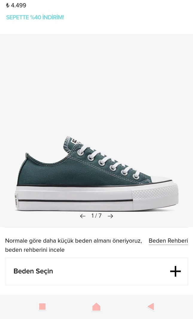 Kadınlar için koyu yeşil renkte, yüksek tabanlı kauçuk spor ayakkabıdır. Düz, desensiz tasarımı günlük sokak stili için uygundur. Normalden küçük beden alınması önerilir.