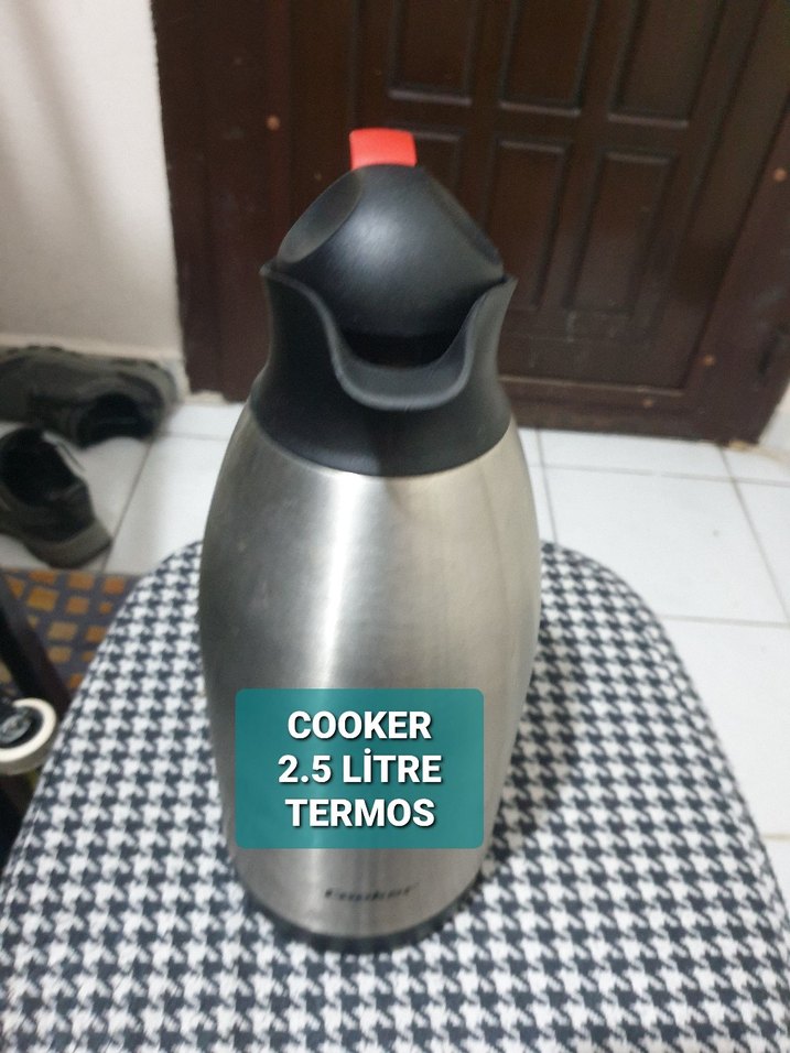 COOKER çelik gövdeli ve siyah kapaklı, içecekleri sıcak tutan modern görünümlü TERMOS. ☕