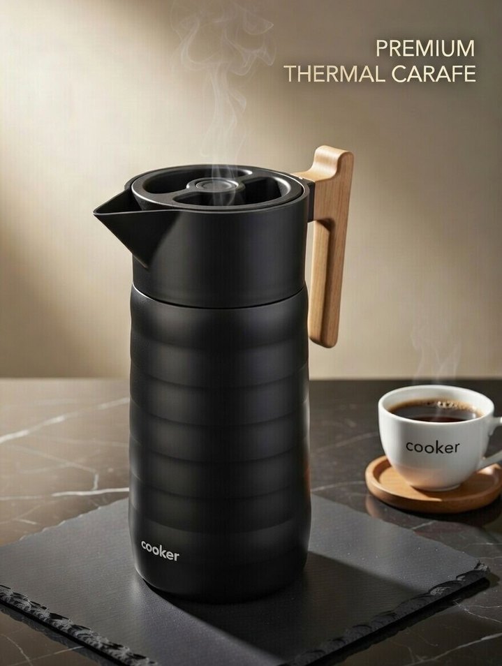 Cooker markalı siyah kahve demliği, ahşap saplı premium termal karafesiyle kahvenizi uzun süre sıcak tutar 2 lt 24 saat sıcak 48 saat soguk tutar