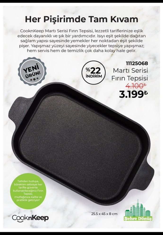 CooknKeep Martı Serisi siyah fırın tepsisi, sağlam yapısıyla ısıyı eşit dağıtarak yemeklerin her noktadan tam kıvamda pişmesini sağlar. Yapışmaz yüzeyi sayesinde servis ve temizlik kolaydır. 25.5x45x8 cm boyutlarındadır.