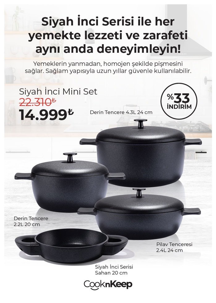 CooknKeep Siyah İnci Mini Set, 4.3L 24cm derin tencere, 2.2L 20cm derin tencere, 2.4L 24cm pilav tenceresi ve 20cm sahan içerir. Yemeklerin yanmadan homojen pişmesini sağlar.