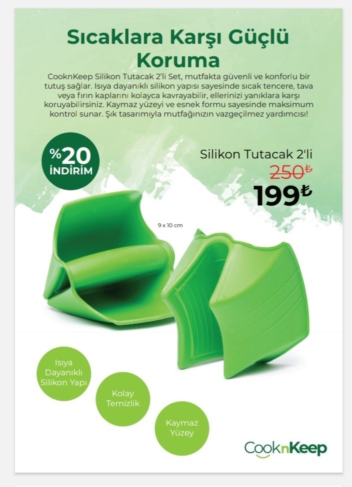 CooknKeep yeşil silikon fırın eldivenleri, kaymaz yüzeyi ve esnek yapısıyla sıcak tencere ve tavaları güvenle kavrar. Isıya dayanıklı, kolay temizlenir ve konforludur.