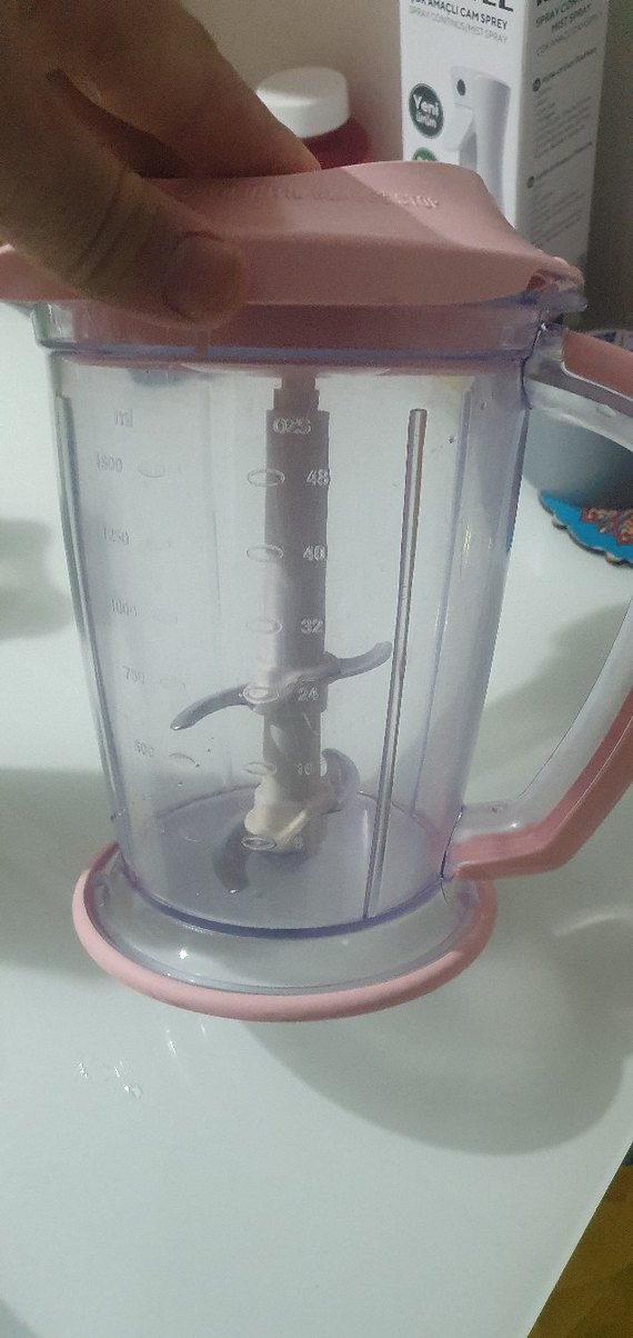 Pastel pembe mini blender haznesi, ölçü işaretli şeffaf kabı ve keskin bıçaklarıyla doğrama ve karıştırma için uygundur. Kulplu ve kapaklıdır.