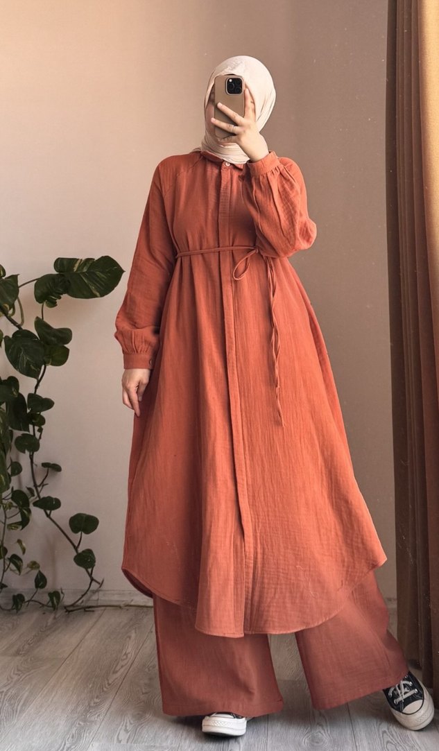 Cool Müslim Kahverengi Kemerli Uzun Keten Takım