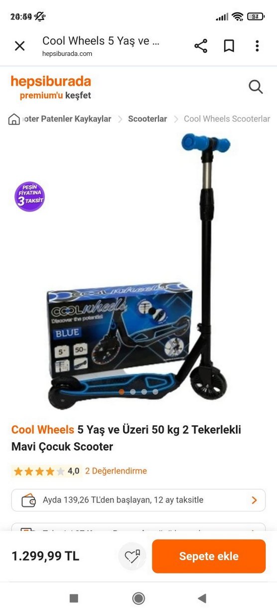 hiç kullanilmadi sadece kutusu yok Cool Wheels markalı, 5 yaş ve üzeri çocuklar için 50 kg taşıma kapasiteli, ayarlanabilir saplı ve dayanıklı tekerlekli mavi çocuk scooterı.