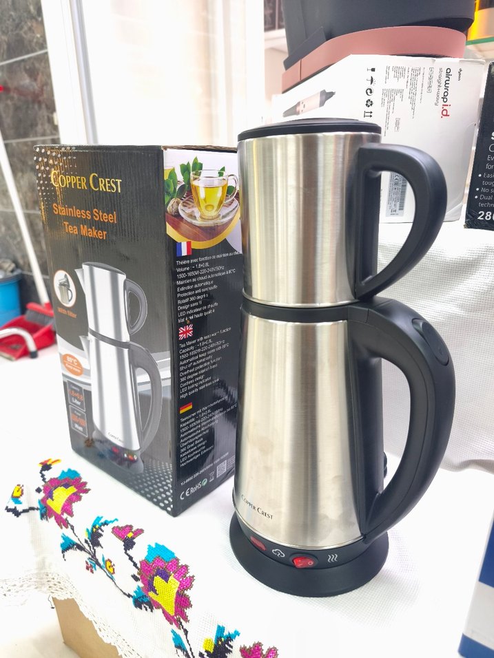 Copper Crest çay makinesi, paslanmaz çelik gövdeye sahip, gri ve kamel renklerde. Çay demlemek için kettle ve demliği bulunur. ☕