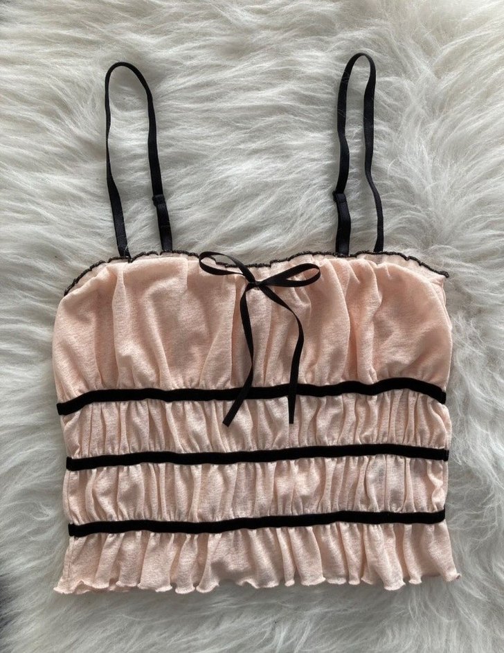 İnce askılı, pembe renkli ve fırfır detaylı bustiyer. Yumuşak sentetik kumaştan, nakışlı ve Paris tarzı gotik görünümde