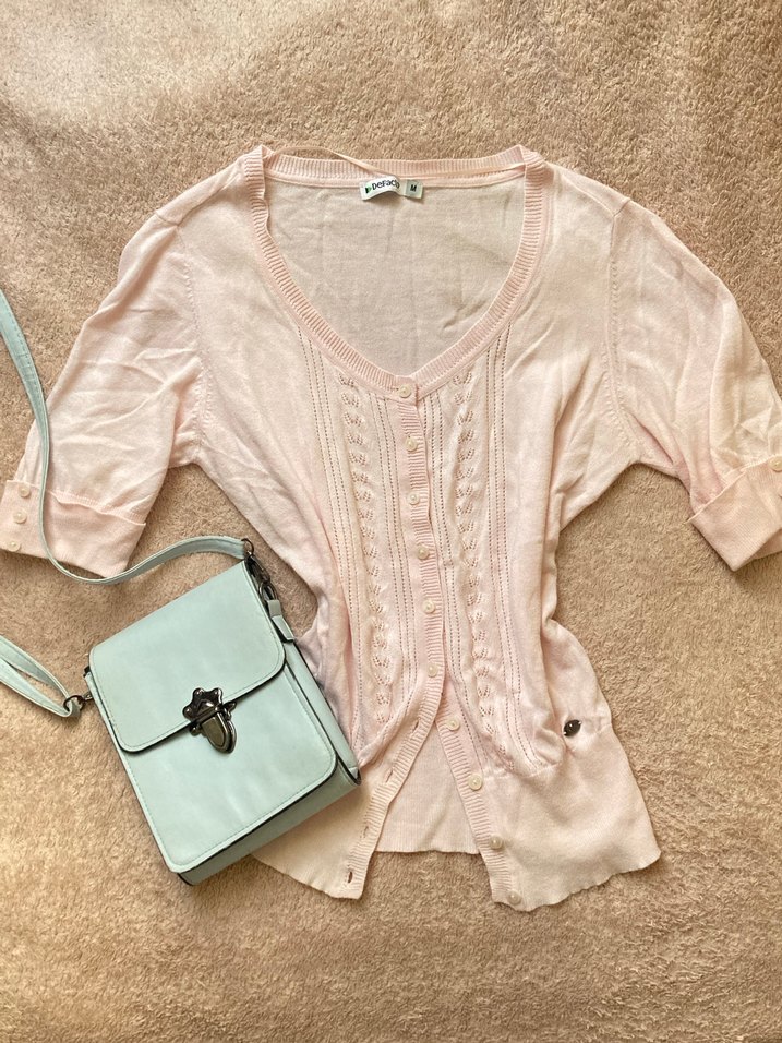 Pembe pastel renkte, keten kumaştan yapılmış, kısa kollu ve V yakalı, düğmeli, mini uzunlukta bol kesim bir hırkadır. bir defa kullandım cok tatlıs tam rengi 2. görseldeki gibi hicbir sorunu yok
