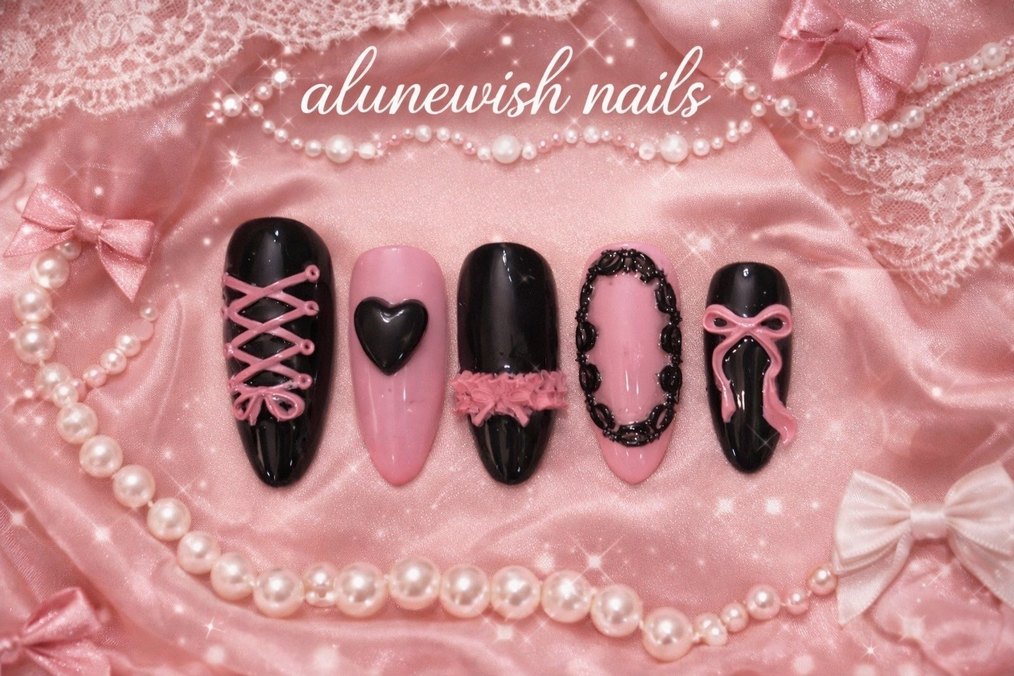El emeği ile özenle hazırlanmış, siyah & pembe coquette temalı özel tasarım press on set XS- S bedendir Satın almadan önce fotoğraflardaki gibi ölçüm yapıp bedeninizi teyit edebiliriz. Fotoğraflar tamamen bana aittir Kalıcı oje ile hazırlanmıştır tekrar tekrar kullanabilirsiniz İnspo: coquette, pinterest, cutecore, lolita