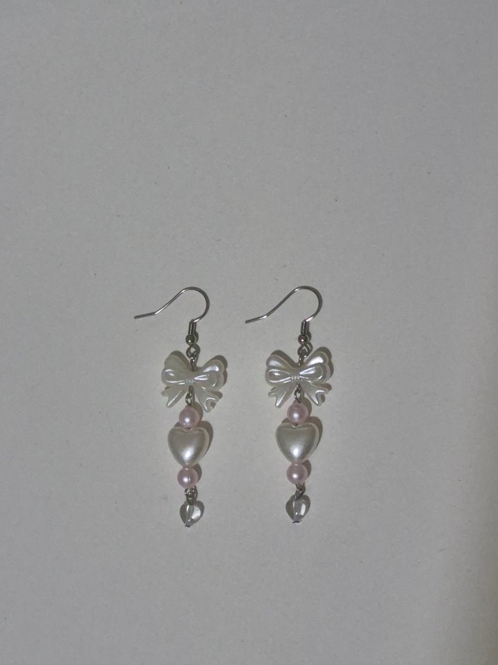 Pembe boncuklu, nakışlı fiyonk ve kalp detaylı, minimalist coquette tarzında midi uzunlukta küpe.