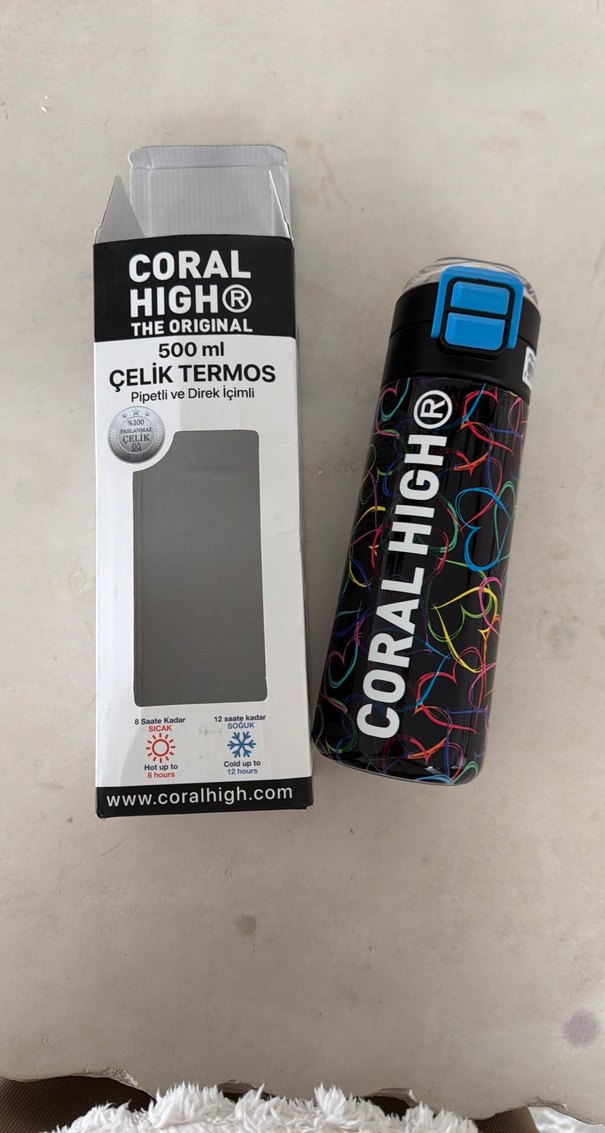 Coral High 500 ml renkli çelik termos, pipetli ve direkt içimli. İçecekleri 8 saate kadar sıcak, 12 saate kadar soğuk tutar. Orjinal sıfır fiyatı 1.350tl