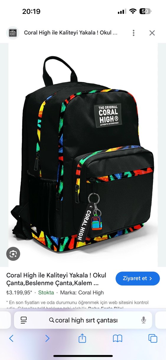 Coral High marka okul çantası, siyah zemin üzerine renkli detaylar ve çoklu bölmeler içerir. Anahtarlık aksesuarı da bulunmaktadır. İkiyanında cep var, 2 dönem kullanıldı. Söküğü defosu yoktur.