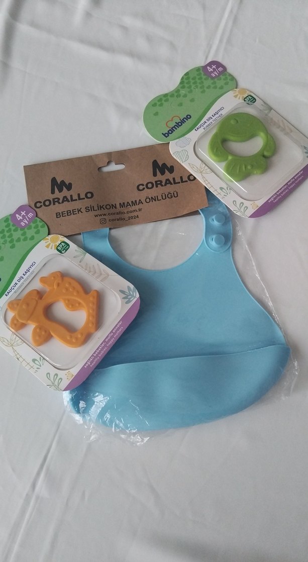 Corallo bebek silikon mama önlüğü pastel mavi renkte, yumuşak silikon malzemeden üretilmiştir. Kolay temizlenir ve döküntüleri yakalayan cep içerir. 4 aylık ve üzeri bebekler için uygundur. Bambino Kauçuk Diş Kaşıyıcı hijyen nedeniyle iade kabul olmamaktır