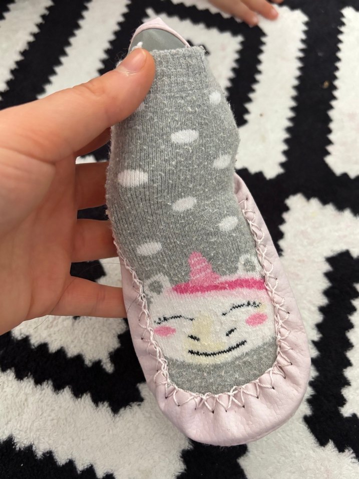 Kız çocuklar için örgü, gri-pembe zebra desenli bohem tarzda sıcak terlik. Rahat ve şık bir görünüm sunar.
