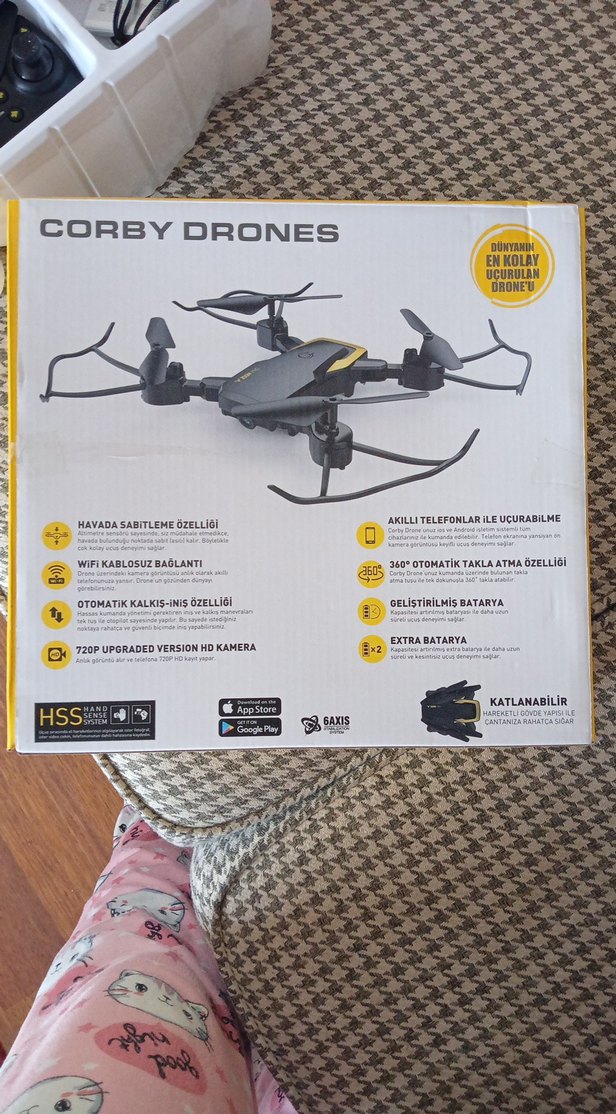 Corby Drones koyu gri drone, 720P HD kamera, WiFi bağlantı, sabitlenme ve akıllı telefon uyumluluğu sunar. Katlanabilir tasarımı ve geliştirilmiş bataryası vardır.