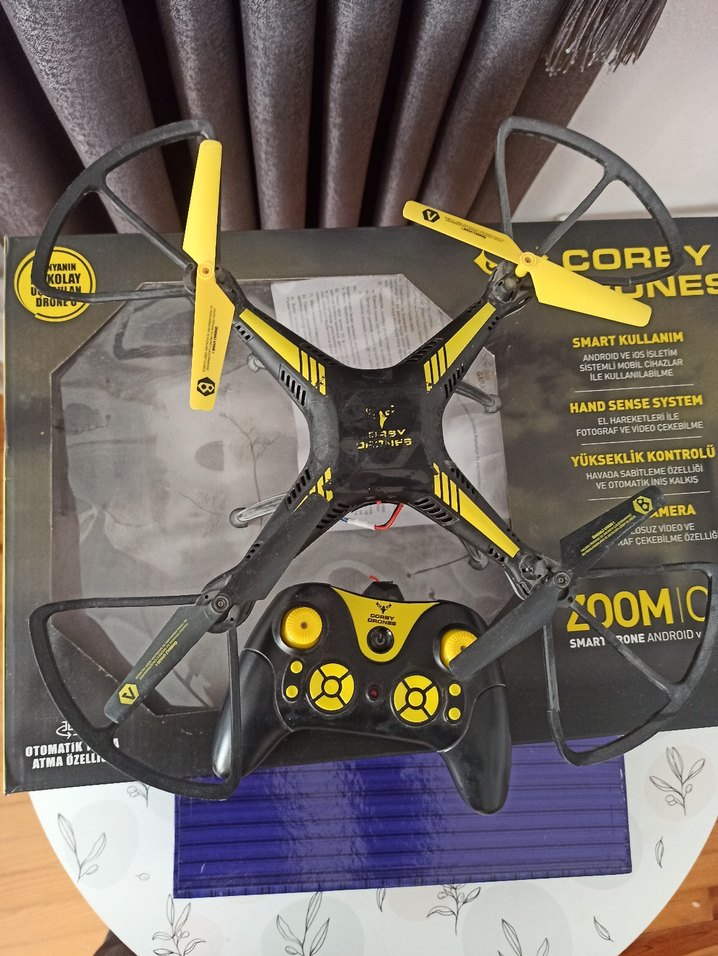 ✍(Bataryası yok şu an çalışmıyor). ✍Corby Drone kameralı yedek pervaneleri ve kumandası ile birlikte .yeni bir 3.7 volt batarya temini ile gökyüzünde yerini alabilir diye düşünüyorum.. Kumandada kırık mevcut ayrıca drone ayaklarina yuvasina pamuk veya bant sıkıştırarak sağlamlaştırdık. ✍telefona yuklenebilen program vasıtasıyla kamera baglantisi ile kayıt ve fotoğraf çekilebilir..sağlam batarya bulunursa uygun fiyata ben bile satmayabilrim..Batarya arayışın devam etmektedir. ✍(isterseniz yedek parça olarakta kullanılabilir drone anakart, pervane motorları, kumanda aktif)