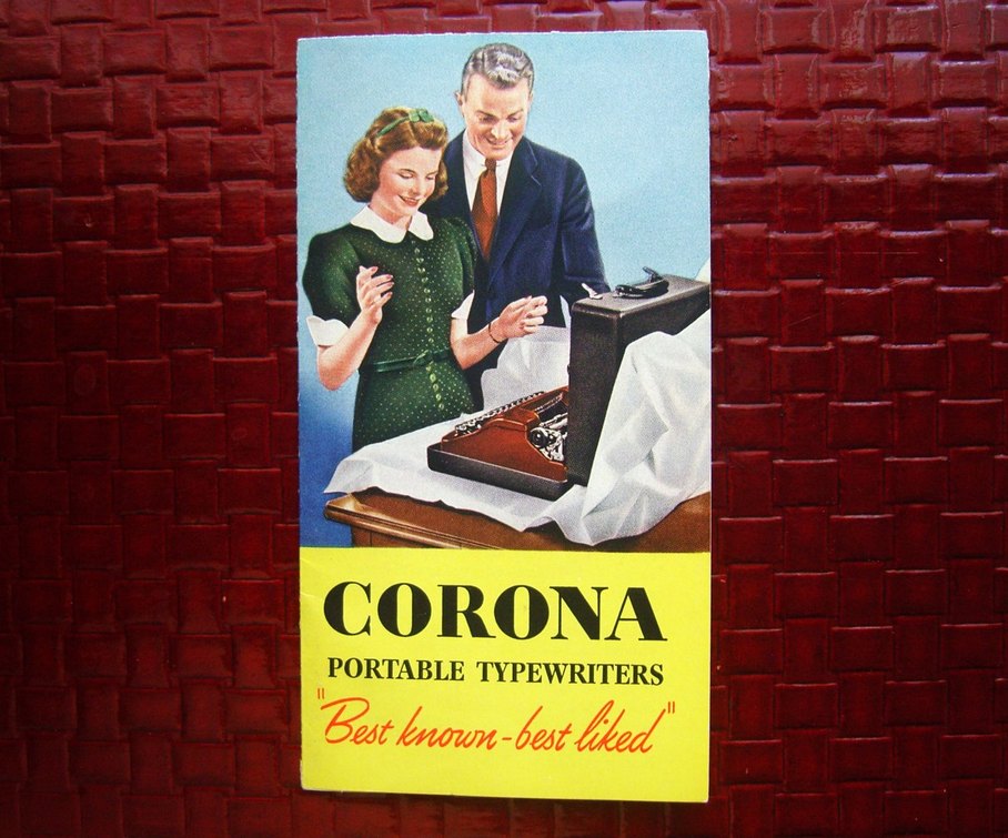 Corona taşınabilir daktiloları tanıtan broşür. "En çok bilinen - en çok beğenilen" sloganıyla vintage bir sahne yer alıyor.