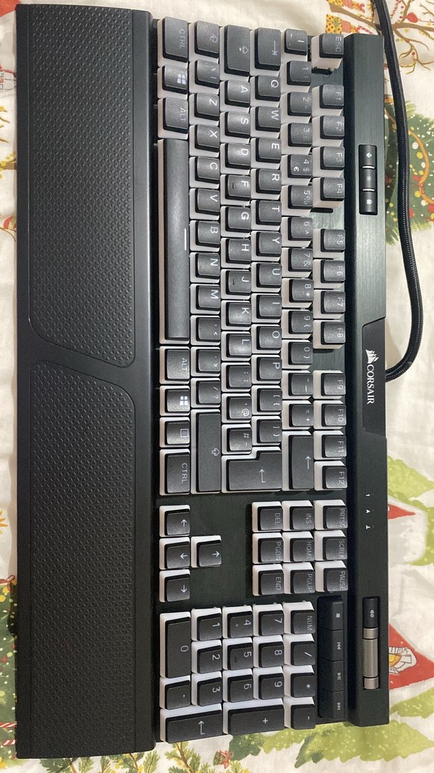 Corsair siyah mekanik klavye, koyu renk tuşlar ve entegre bilek desteği ile rahat yazım sağlar. Medya kontrolleri ve ses tekerleği bulunur. ⌨️ 2. Resimde gözüken yer hariç bir sorunu yok sıfır gibi