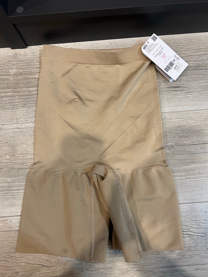 Bej midi uzunlukta, belden kemerli ve vücuda oturan hamile şortu, yumuşak sentetik kumaştan günlük kullanım için uygun.