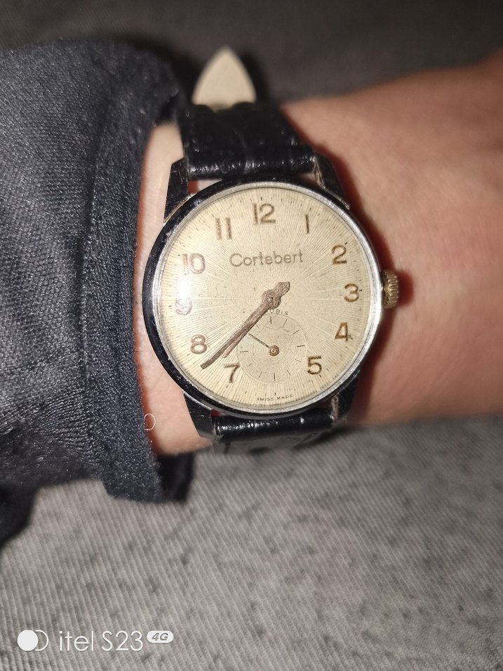 Cortebert markalı vintage erkek kol saati, bej kadranlı ve gri rakamlıdır. Siyah deri kayış ve küçük saniye göstergesi bulunur. ⌚