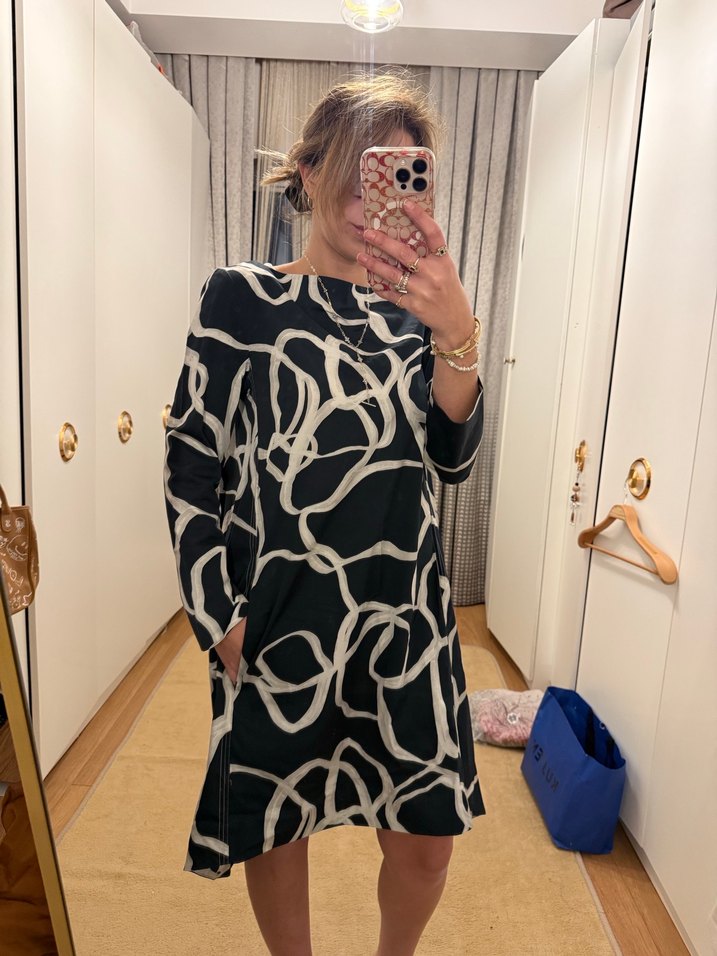 Çok şık desenli, uzun kollu ve yuvarlak yakalı bol kesim elbise. Dikiş detayları ve koyu lacivert renkli pamuklu poplin kumaştan üretilmiştir. Günlük ve ofis kullanıma uygundur. 36 beden ama cos kesimi 38/40 beden uyumludur. Sıfır üründür
