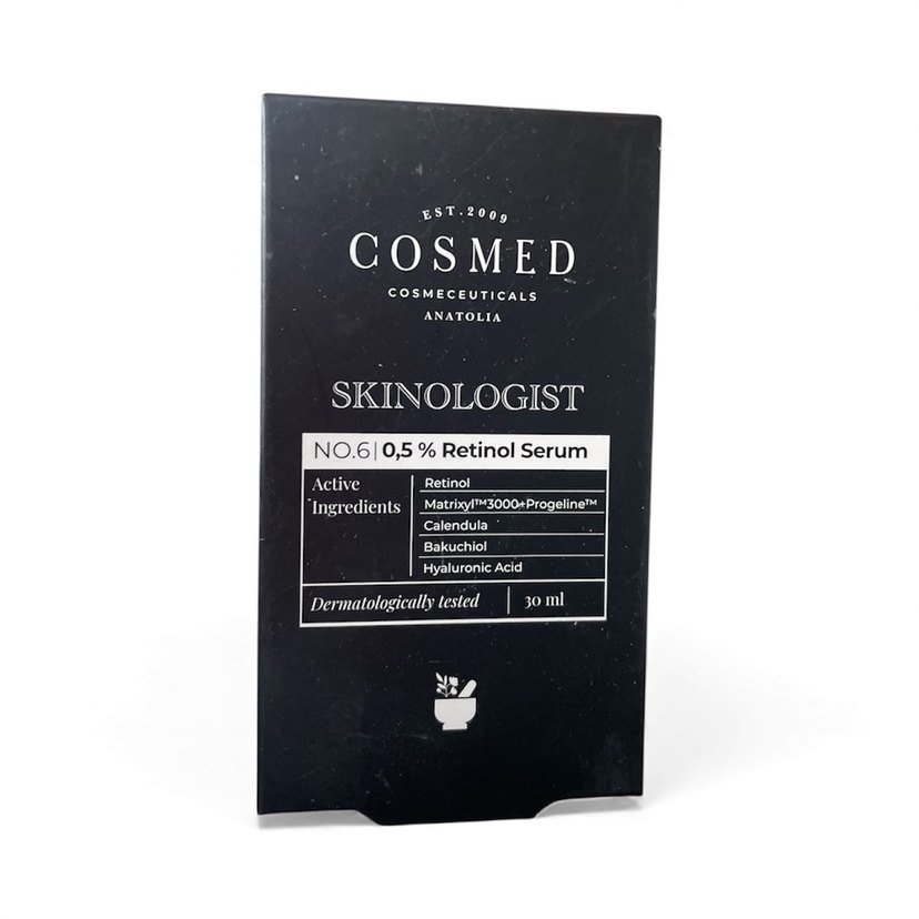 COSMED Skinologist Retinol Serum, %0,5 retinol, hyaluronik asit, calendula, bakuchiol ve Matrixyl®3000 Progeline™ içerir. Dermatolojik olarak test edilmiştir, 30 ml.