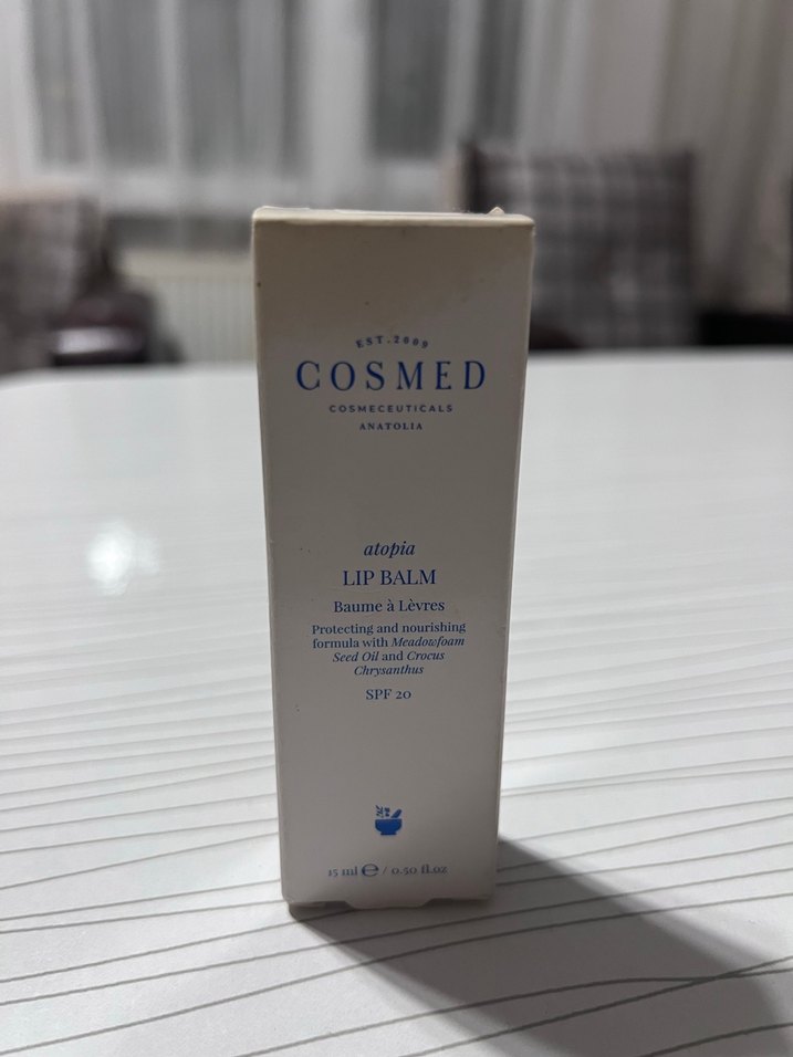 Cosmed Atopia Lip Balm (15 ml, SPF 20) Açılmamış kutusundadır. 5. fotoğraf temsilidir (ürün etiketi açılmadığı için). Ürünün ortalama satış fiyatına ve kullanıcı yorumlarına internetten bakabilirsiniz. SKT: 03/27