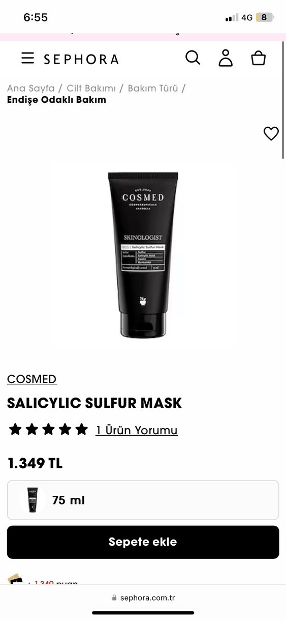 Cosmed Skinologist markasına ait 75 ml Salisilik Kükürt Maskesi. Salisilik asit ve bentonit içerir. Iki uc kez kullandim