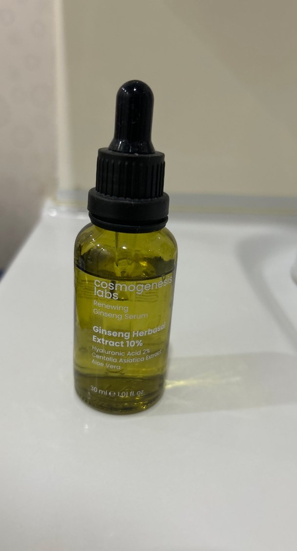 Cosmogene Labs yenileyici serum, %10 ginseng bitkisel öz, %2 hiyalüronik asit, Centella Asiatica özü ve aloe vera içerir. Cilt yenilenmesini ve nemlenmesini destekler.