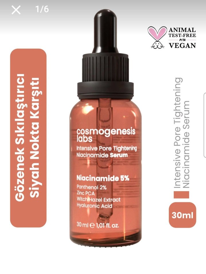 5% niacinamide, 2% panthenol, çinko PCA, cadı fındığı özü ve hyaluronik asit içeren, gözenek sıkılaştırıcı ve siyah nokta karşıtı vegan serum. aldığımda kutusunu atmıştım birkaç ürünle birlikte almıştım hiç kullanılmadı fotoğraftan da bellidir.