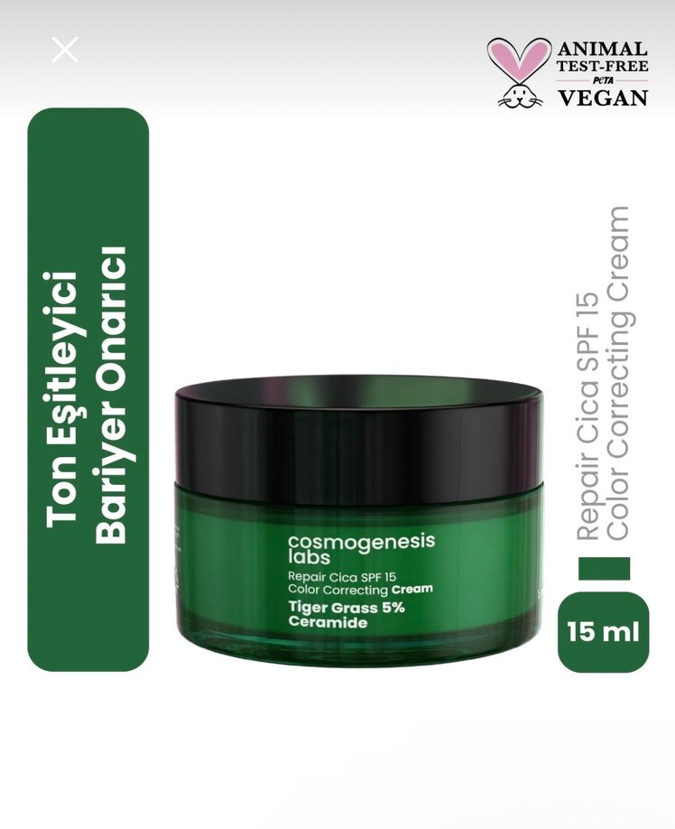 Cosmogenesis Repair Cica SPF 15 içeren, %5 Tiger Grass ve seramid ile ton eşitleyici ve bariyer onarıcı krem. Vegan ve hayvan testi yapılmamıştır.