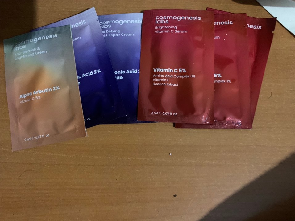 Cosmogenesis Aydınlatıcı Vitamin C Serumu, %5 vitamin C, amino asit kompleksi ve meyan kökü özü içerir. Cilt aydınlatma ve onarım için 2 ml poşetler halinde.