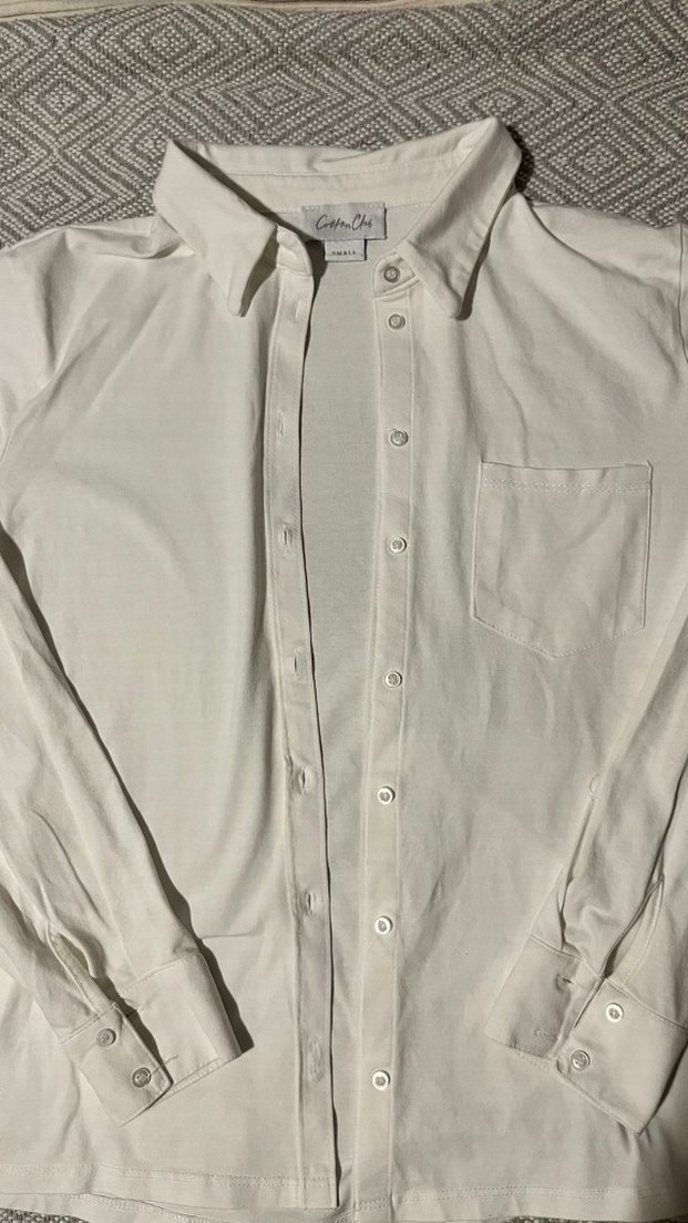 Beyaz pamuklu gömlek, düğmeli ve yakalıdır. Uzun kollu, normal kesim ve cep detaylıdır. Günlük kullanıma uygundur. Hiç kullanılmadı.
