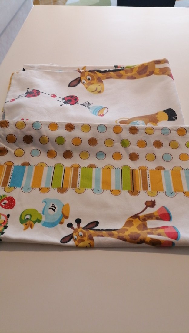 Renkli baskılı desenlere sahip, zürafa ve kuş figürleri içeren çocuk nevresim ve yastık kılıfı. Çarşafı yoktur. Leke, solma yoktur. Temiz kullanılmıştır.