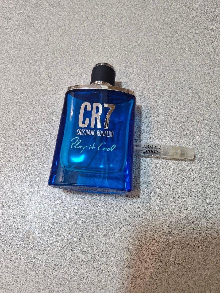 ORJİNAL ŞİŞESİ SADECE CR7 Cristiano Ronaldo erkek parfümü, renkli mavi şişede, minimalist ve karşı kültür tarzında. Şişede 'CR7' ve 'Play it Cool' yazıları bulunur.