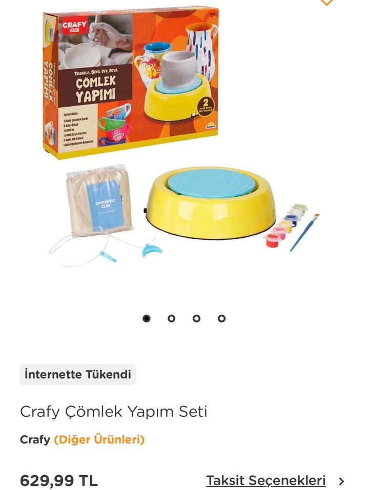 Crafy çömlek yapım seti, sarı tekerlek, boyalar, fırça ve araçları içerir. Yaratıcı oyun ve el becerilerini destekler.
